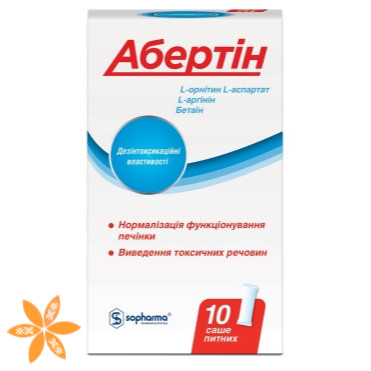 Абертін дієтична добавка до раціону харчування - додаткове джерело: L-аргініну, бетаїну, L-орнітину L-аспартату, сприяє нормалізації функціонування печінки, попередженню наслідків гепатоксичної дії алкоголю, виведенню токсичних речовин з організму, нормальному метаболізму гомоцистеїну.