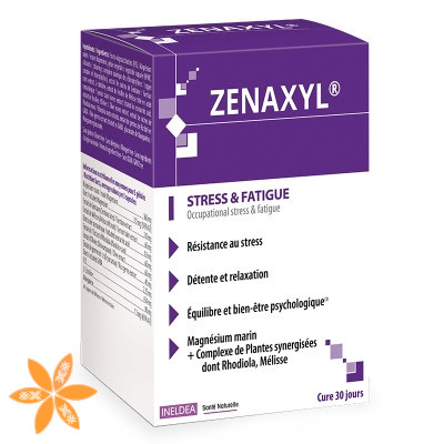 ZENAXYL® - Дієтична добавка на основі концентрованої морської води, багатої магнієм, екстрактів родіоли, генціани, меліси, титрованої в розмаринову кислоту, оливкового дерева, зародків рису, титрованих у ГАМК, цитруліну, фруктоолігосахаридів і марганцю.