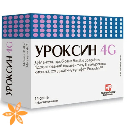 УРОКСИН 4G - дієтична добавка до раціону харчування на основі Д-манози, ProQutin™, запатентованої комбінації, що містить прополіс та кверцетин, Bacillus coagulans з пробіотичною дією та гідролізований колаген типу II, гіалуронову кислоту та хондроїтину сульфат, має виражену антимікробну та протизапальну дію, також сприяє прискоренн- ню процесу регенерації пошкоджених тканин уротелію.